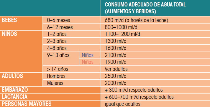La tabla 7.1 presenta las recomendaciones de ingesta diaria de agua por edades recomendada por la Autoridad Europea de Seguridad Alimentaria:1